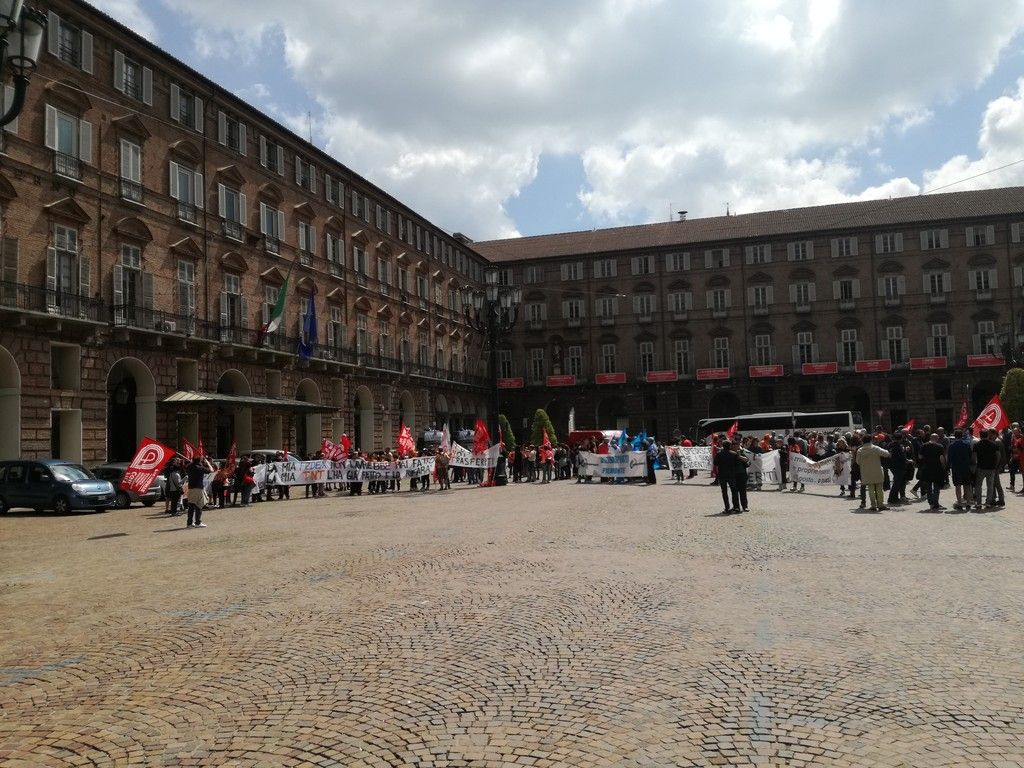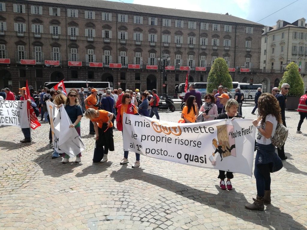 Dopo il corteo che stamattina ha bloccato corso Giulio Cesare i lavoratori che si oppongono a licenziamenti e trasferimenti hanno manifestato in piazza Castello, come già Embraco e Italia On Line. Appuntamento al Mise il 25 maggio