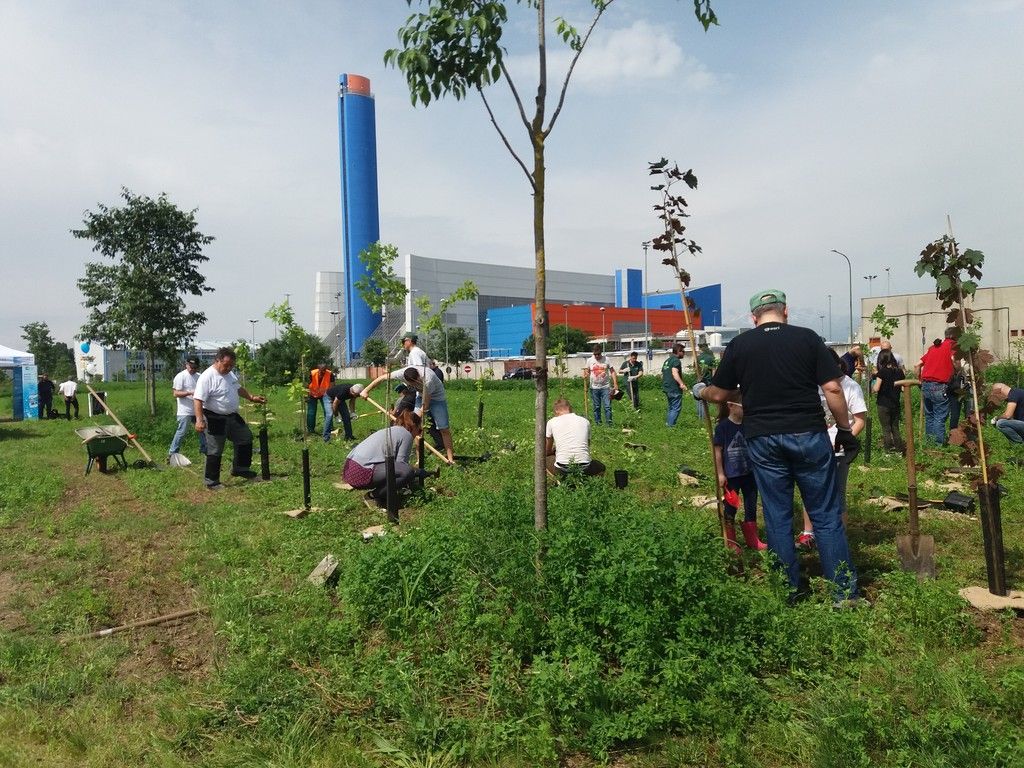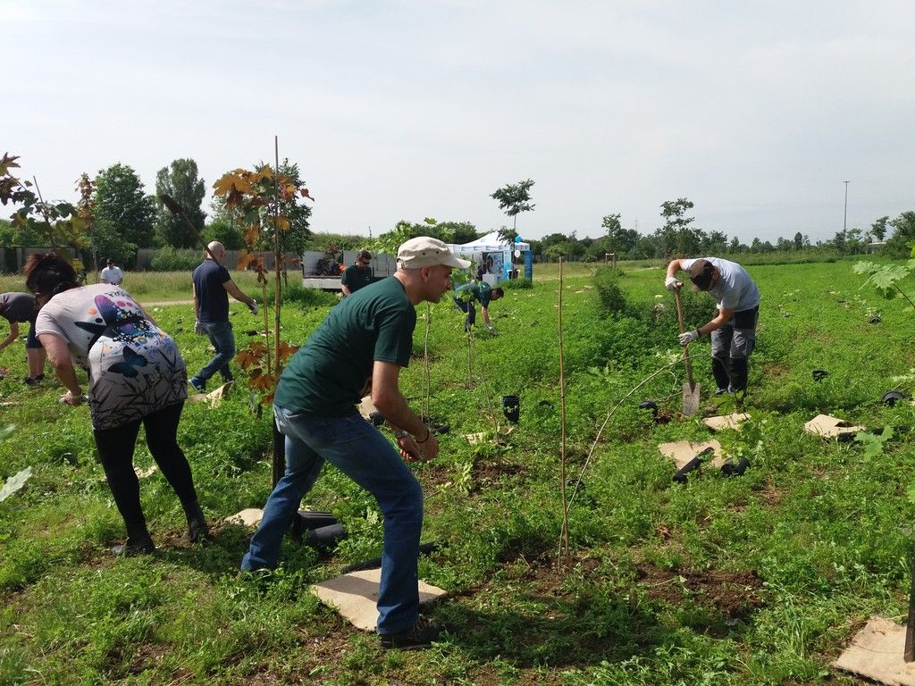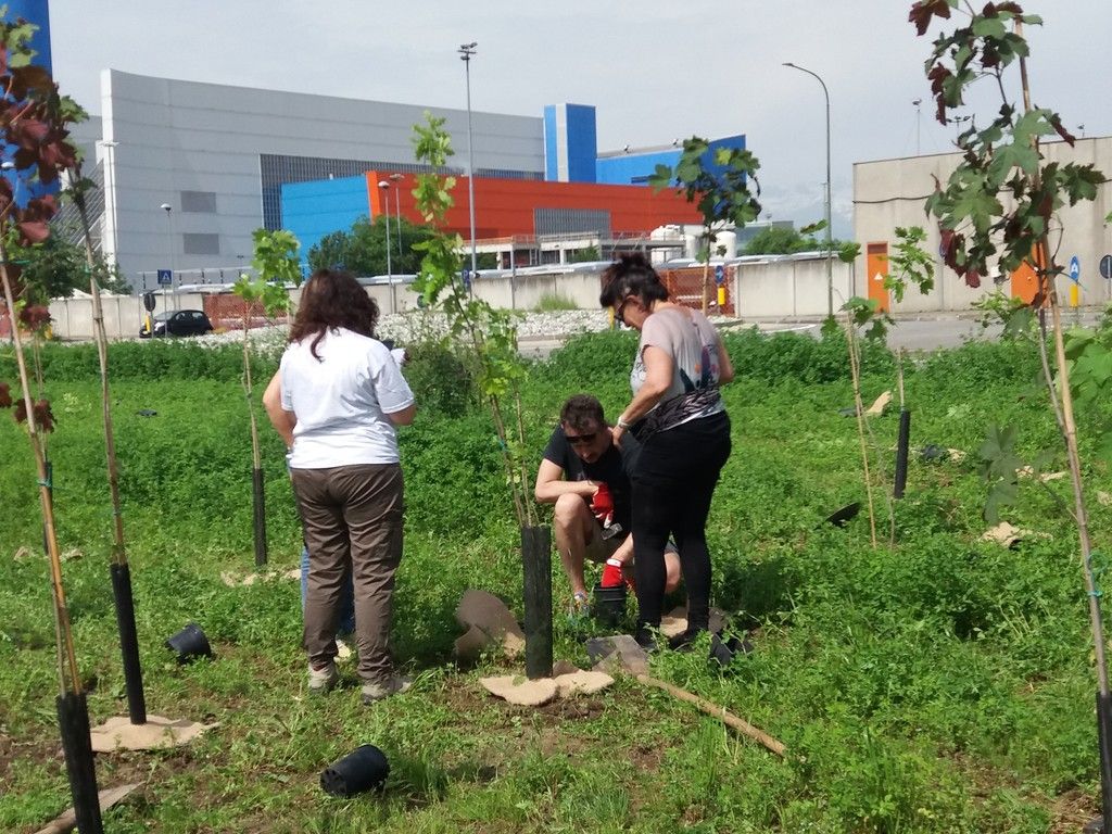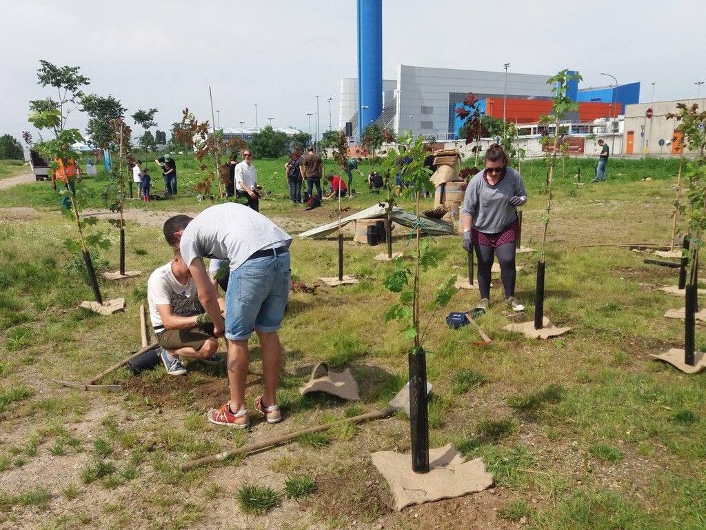 Il sole splende sull'esercito di pale, zappe e carriole che dalle 9 di questa mattina, domenica 27 maggio, stanno lavorando nell'area verde ai piedi del termovalorizzatore, in via Gorini.