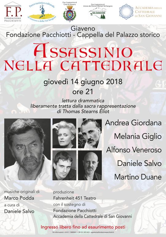 Si inizia giovedì 14 giugno alle 21 nella Capella della Fondazione Pacchiotti con il celebre attore Andrea Giordana nei panni dell’arcivescovo di Canterbury Thomas Beckett. Si terrà quindi in Valle l’anteprima del dramma teatrale Assassinio nella Cattedrale, che sarà poi allestito la sera successiva, venerdì 15 giugno, nel Duomo di Torino. Con il famoso attore saranno in scena anche Melania Giglio, Alfonso Veneroso, Daniele Salvo e Martino Duane, in una pieces con musiche originali di Marco Podda.