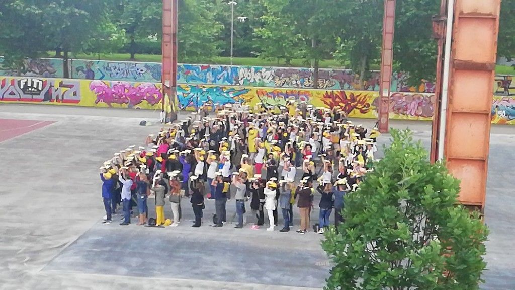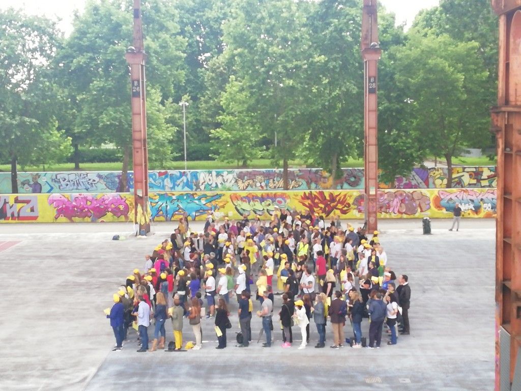 Oltre duecento dipendenti, muniti di cappelli e cartelli gialli si sono posizionati sotto la tettoia delle ex acciaierie Savigliano in modo da formare la scritta "#1di400", che è diventata lo slogan della protesta.