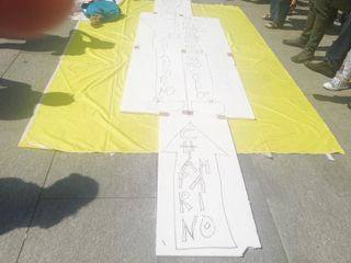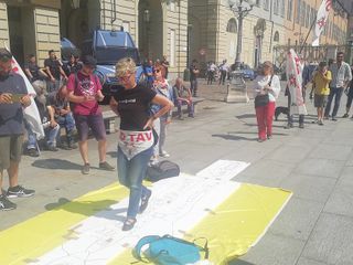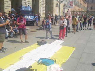 Camminando sopra il cartonato steso di fronte a Palazzo Lascaris