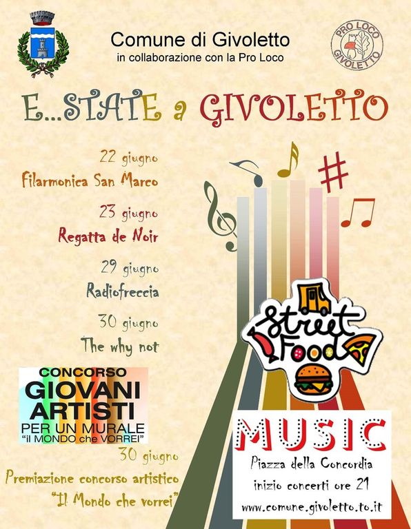 Il Comune di Givoletto in collaborazione con la Pro Loco, al fine di promuovere il territorio e regalare alcune serate di piacevole musica e clima gradevole, organizza E… STATE A GIVOLETTO. Una rassegna musicale alla quale parteciperanno quattro gruppi musicali noti nel torinese ma non solo.