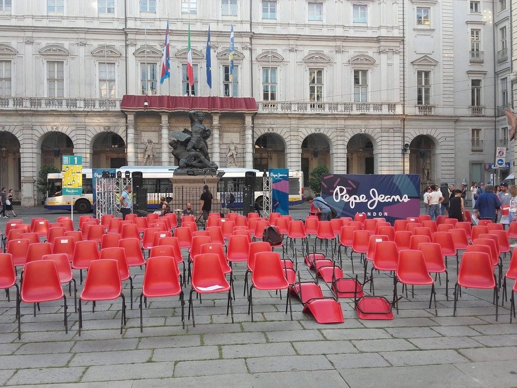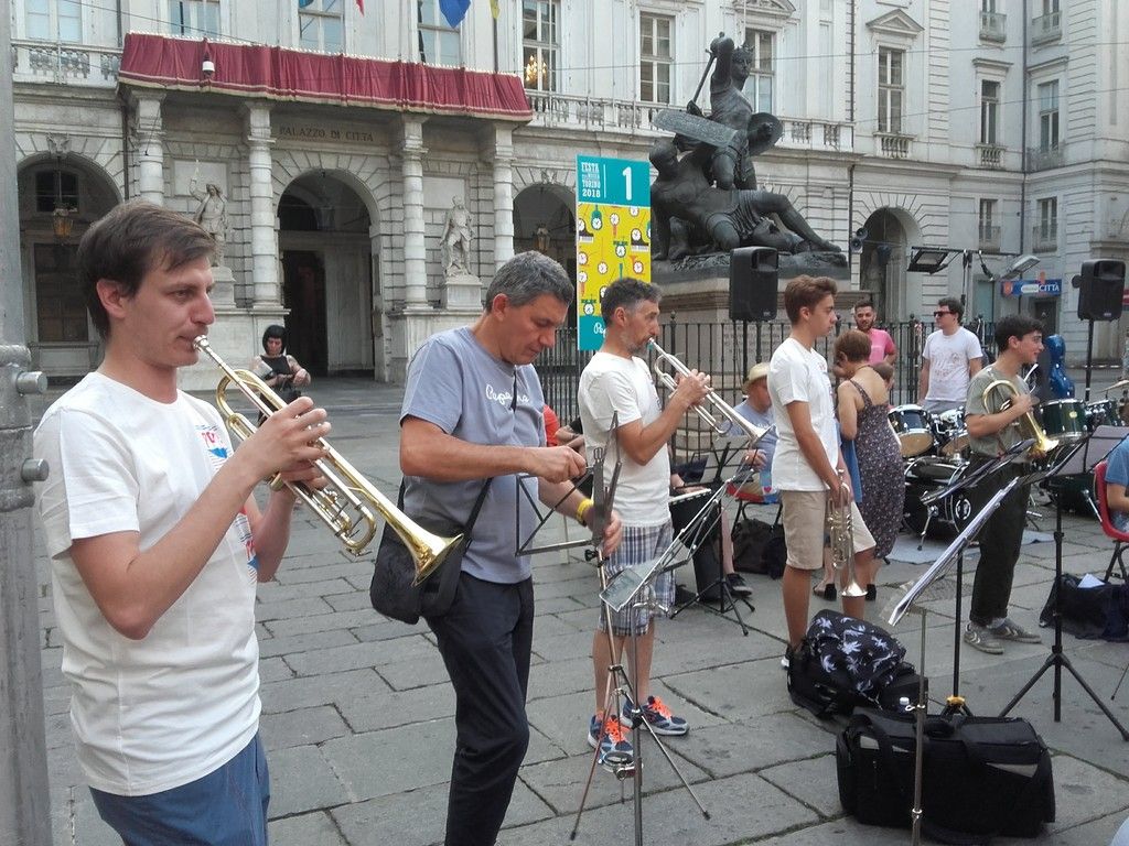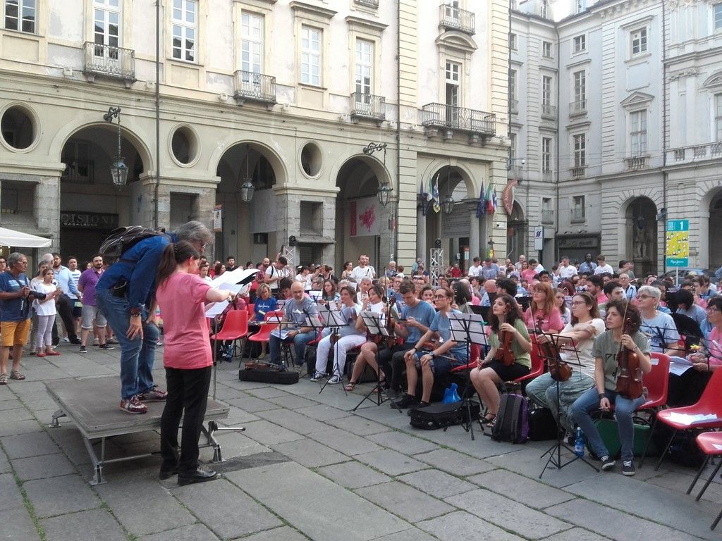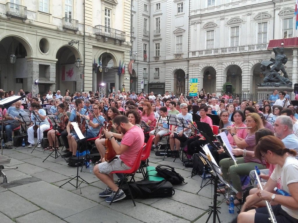 I primi musicisti prendevano posto e accordavano gli strumenti, quando ancora in tanti erano pazientemente in fila ad attendere di essere registrati. In fine, alle 21 l’orchestra ha preso forma, le sedie non sono bastate, tanta e tale è stata l’adesione dei musicisti torinesi, e così tromboni, trombe e percussionisti sono rimasti in piedi per un totale di circa 270 partecipanti.