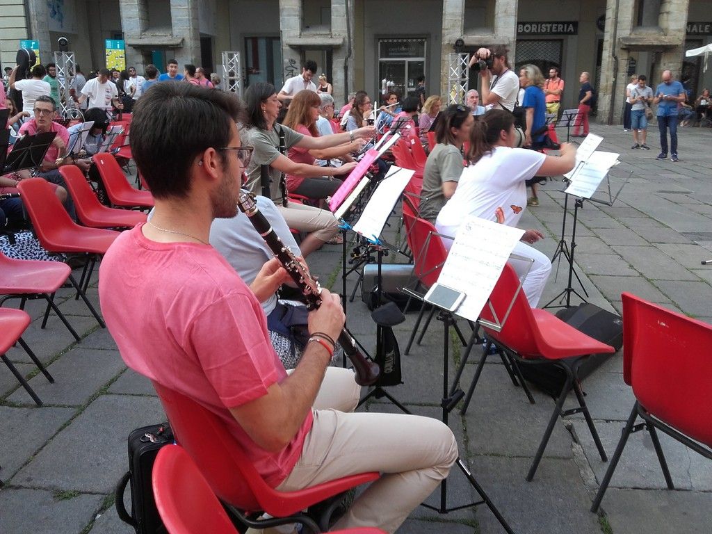 Ed è così che ieri sera ha preso vita un’orchestra in piazza, un ensemble nuovo di zecca, composto da musicisti dalle più diverse provenienze. A partire dalle 20, sono giunti in Piazza Palazzo di Città violini e flauti, clarinetti e percussioni, sassofoni, oboi e, tra la sorpresa e l’entusiasmo generale, persino un’arpa. In un vivace e colorato happening che ha attirato, col passare dei minuti e l’aumentare della confusione, l’attenzione dei passanti.