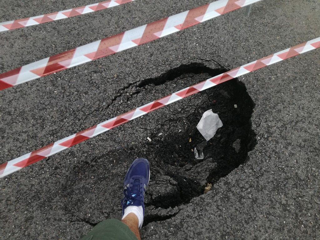 Da questa mattina, invece, camion, scavatrice e operai in azione: la buca è stata prima ampliata e ora sarà riparata, in modo da ripristinare completamente il manto stradale.