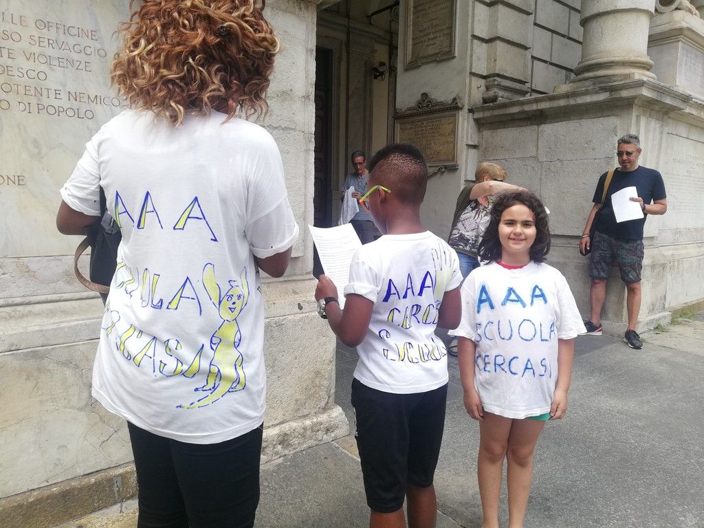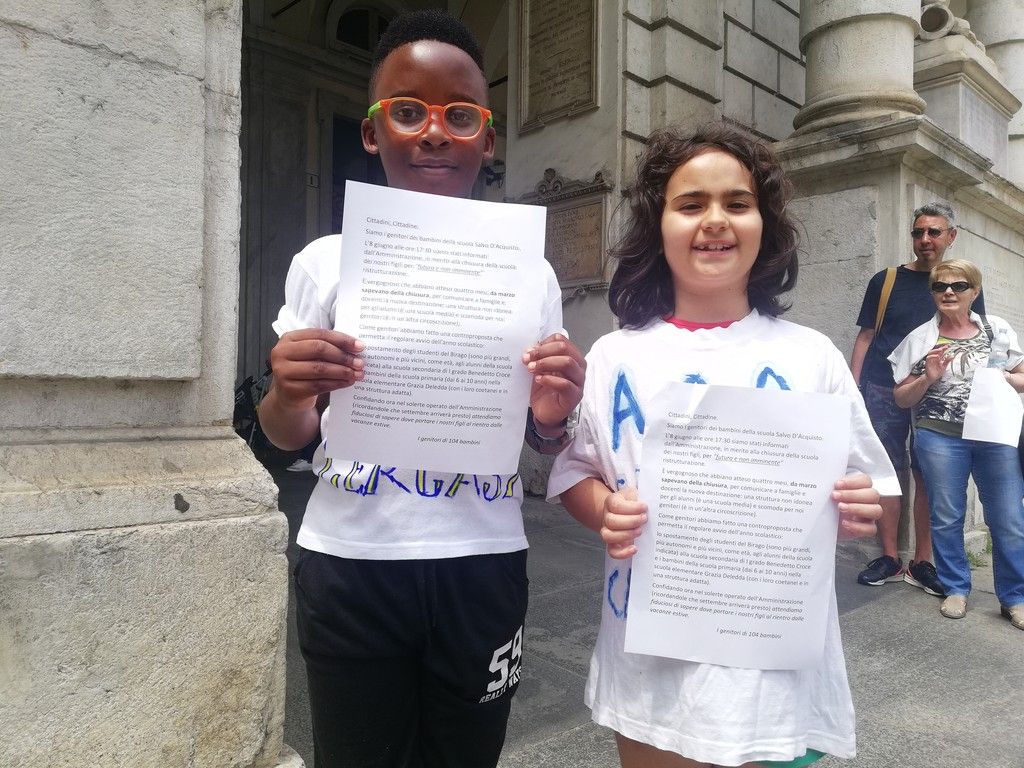 Protesta dei bimbi e genitori della scuola primaria Salvo D’Acquisto di via Tollegno davanti al Comune di Torino. Lo scorso 8 giugno l'amministrazione ha informato le mamme e i papà che, a causa dei problemi strutturali, l'edificio verrà chiuso e cinque classi trasferite nella Benedetto Croce di corso Novara.