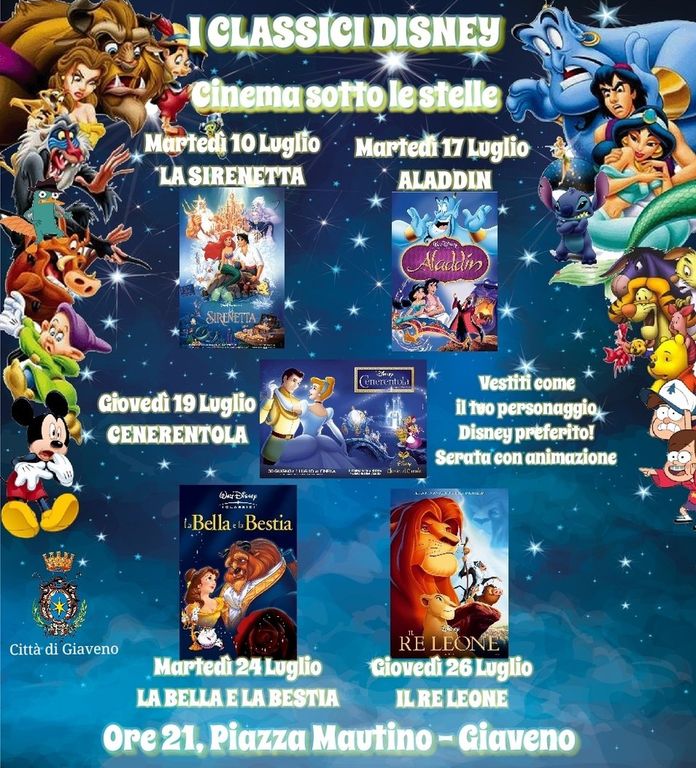 La seconda locandina riguarda la rassegna di film “I Classici Disney”, nell’ambito di “Cinema sotto le stelle”, proiezioni gratuite in piazza Mautino con inizio alle ore 21. Martedì 10 “La Sirenetta”, martedì 17 “Aladdin”, giovedì 19 “Cenerentola”, martedì 24 “La Bella e la Bestia”, giovedì 26 “Il Re Leone”.