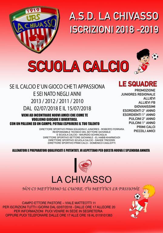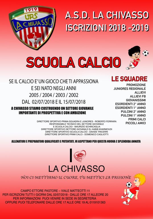 Vieni a conoscere, dal 02/07/2018 al 15/07/2018 i nostri istruttori a chivasso stiamo costruendo un settore giovanile importante , di prospettiva e con ambizione.