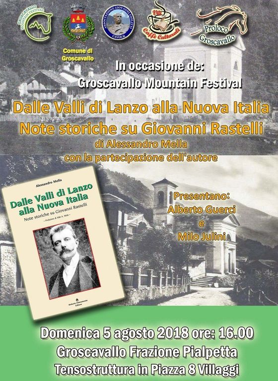 Ne parlerà Alessandro Mella, con il suo nuovo libro, in occasione del Groscavallo Mountain Festival. Alla tensostruttura della rassegna alpestre, infatti, sarà presentato, il 5 agosto alle ore 16.00, il volume dal titolo “Dalle Valli di Lanzo alla Nuova Italia – Note Storiche su Giovanni Rastelli”. Ad intervistare l’autore ci saranno l’assessore al comune di Viù Alberto Guerci e lo storico e scrittore Milo Julini. Porterà il suo saluto il sindaco di Groscavallo Maria Cristina Cerutti Daffara. L’evento è stato organizzato con il concorso della Pro Loco di Groscavallo e dell’Amministrazione Comunale, dei Caffè Culturali Viù e dell’Associazione di Studi Storici Giovanni Giolitti di Cavour.