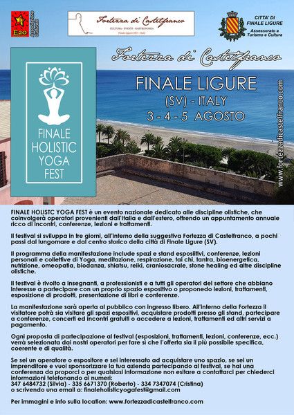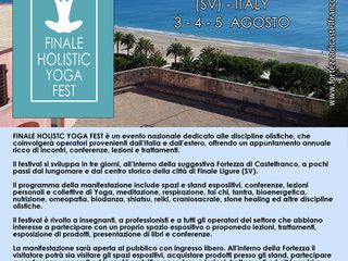L'associazione Culturale E20, con il patrocinio e la collaborazione del Comune di Finale Ligure, organizza per i giorni del 3,4 e 5 agosto di quest'anno la prima edizione del FINALE HOLISTC YOGA FEST, un evento nazionale dedicato alle discipline olistiche, che coinvolgerà operatori provenienti dall'Italia e dall'estero, offrendo un appuntamento annuale ricco di incontri, conferenze, lezioni e trattamenti.