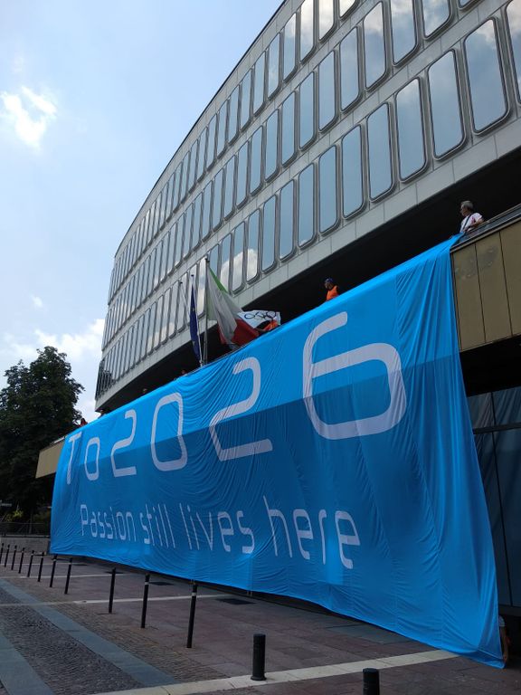 Il manifesto è stato appeso alla balconata del Palazzo Affari di Carlo Mollino, sede degli uffici della Camera di Commercio, che fin da subito ha creduto in Torino 2026. Il gigantesco cartello è poi stato srotolato nell’area della ex Thyssen, che secondo il pre-dossier consegnato al Coni ospiterà il villaggio olimpico. Nelle scorse settimane era stato collocato davanti al Duomo e sulla facciata del grattacielo Lancia.