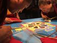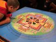 La creazione del mandala di sabbia inizia con una cerimonia di apertura dove i monaci intonano dei mantra e suonano flauti e tamburi. Poi si mettono al lavoro e in primo luogo misurano e disegnano con attenzione i contorni principali del mandala su una superficie piana, con un gessetto o con la matita. Una volta che lo schema di base è pronto, milioni di granelli di sabbia colorata verranno disposti accuratamente nelle diverse sezioni del disegno. I granelli di sabbia verranno versati sulla superficie con un imbuto di metallo stretto chiamato chakpur. La composizione di un mandala può richiedere giorni o addirittura intere settimane. Mandala è un'antica parola sanscrita che può tradursi con “cerchio” o “centro” e, come cerchio, è una rappresentazione essenziale, geometrica del mondo e del cosmo.
