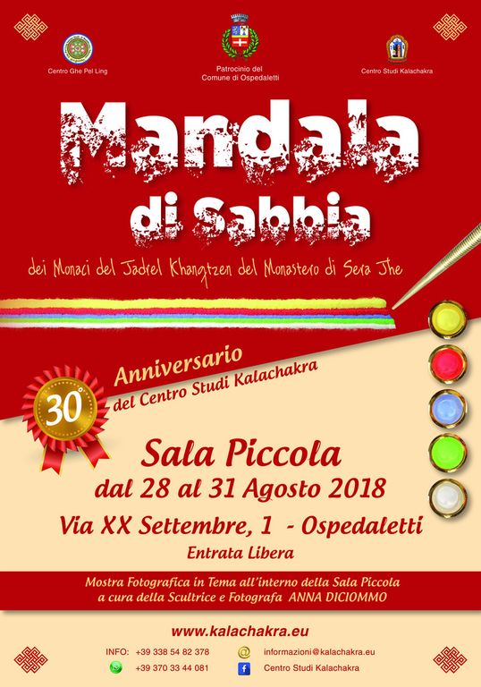 In occasione del 30° anniversario del Centro Studi Kalachakra, dal 28 al 31 agosto, presso la Sala Piccola del Comune di Ospedaletti in via XX Settembre, cinque monaci tibetani del Jadrel Khangtzen del Monastero di Sera Jhe realizzeranno un mandala di sabbia. Sempre all'interno della sala ci sarà una piccola mostra fotografica in tema a cura della scultrice e fotografa Anna Diciommo. L'evento organizzato dal Centro Ghe Pel Ling e dal Centro Studi Kalachakra con il patrocinio del Comune di Ospedaletti ha come scopo quello di sostenere i monaci e le attività di Dharma ed aperto al pubblico.