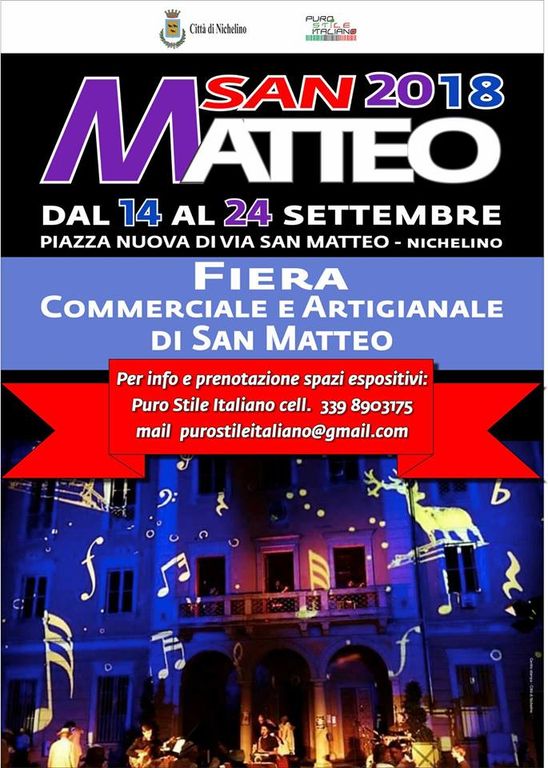 Domenica 16: “Corri a San Matteo - XXV Ediz.” Manifestazione regionale di corsa su strada di km. 9 con uovo percorso cittadino. Ritrovo in piazza A. Moro alle ore 8.00. Partenze (competitiva e non) dalle ore 9.00. La manifestazione riservata ai diversamente abili (m. 3.500) partirà alle ore 8.50. In collaborazione con il CISA 12, l’Ass. Il Giglio e con la partecipazione dell’ass. Caluire Athlétisme – FR . A cura dell’Ass. G.S. Atletica Nichelino. Per info e iscrizioni cell. 3384413310