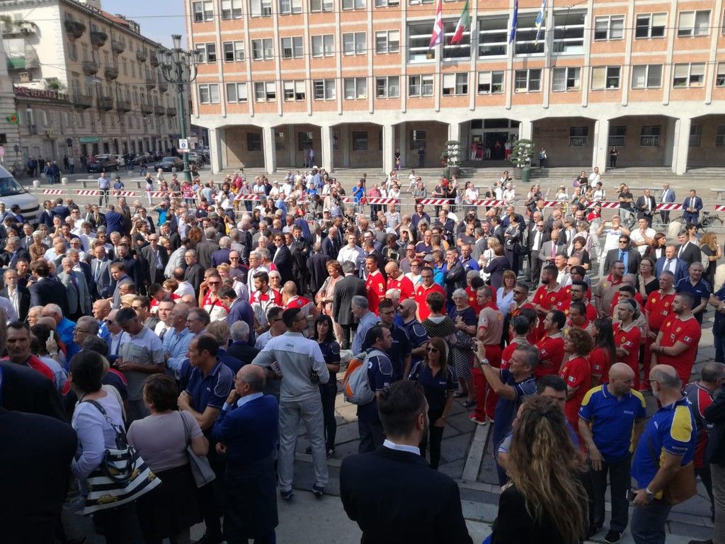 Prende la parola alla fine, dopo la comunione, nel silenzio del duomo di Torino, mentre alle sue spalle si notano anche i gonfaloni di Juventus e Ferrari, insieme a quelli delle istituzioni.