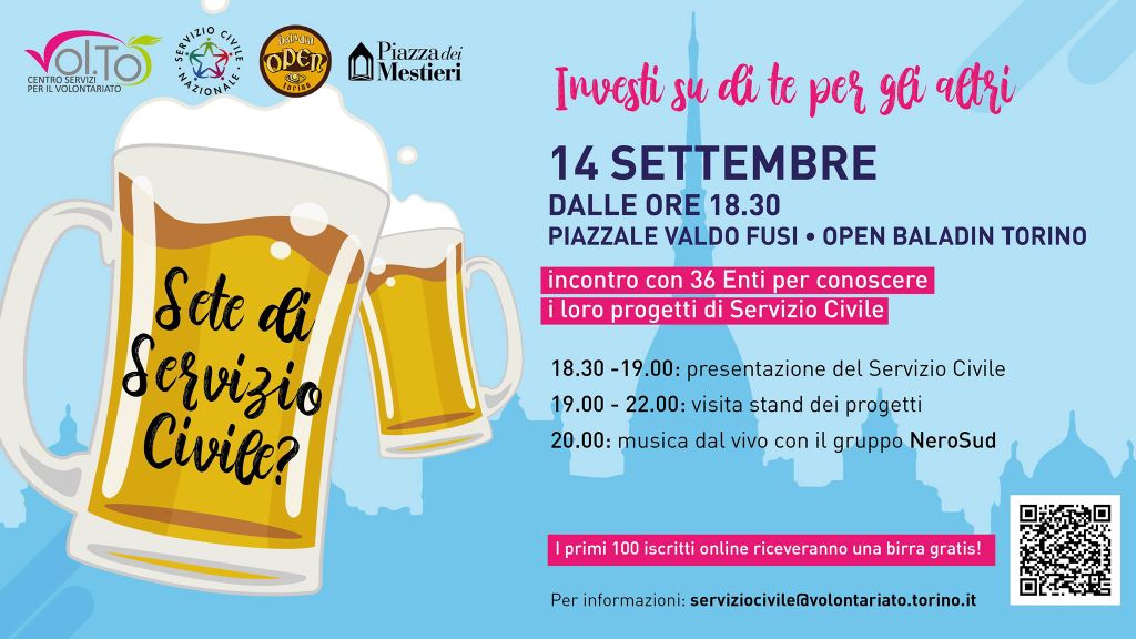 Il Centro Servizi Vol.To, in collaborazione con Open Baladin Torino e Piazza dei Mestieri, ha organizzato una festa per presentare ai giovani i progetti di Servizio Civile e le Associazioni che li propongono. L’appuntamento è per oggi in piazzale Valdo Fusi a Torino, a partire dalle 18.30, con il seguente programma:
