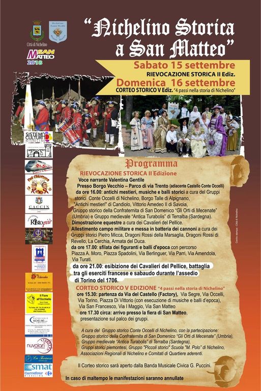 L'evento è a cura del Gruppo storico Conte Occelli di Nichelino, con la partecipazione di: Gruppo storico della Confraternita di San Domenico “Gli Orti di Mecenate” (Umbria), Gruppo medievale "Antica Turabolis" di Terralba (Sardegna), Gruppi storici piemontesi, gruppo "Piccoli storici" Scuola "M. Polo" di Nichelino, Associazioni Regionali di Nichelino e Comitati di Quartiere aderenti.
