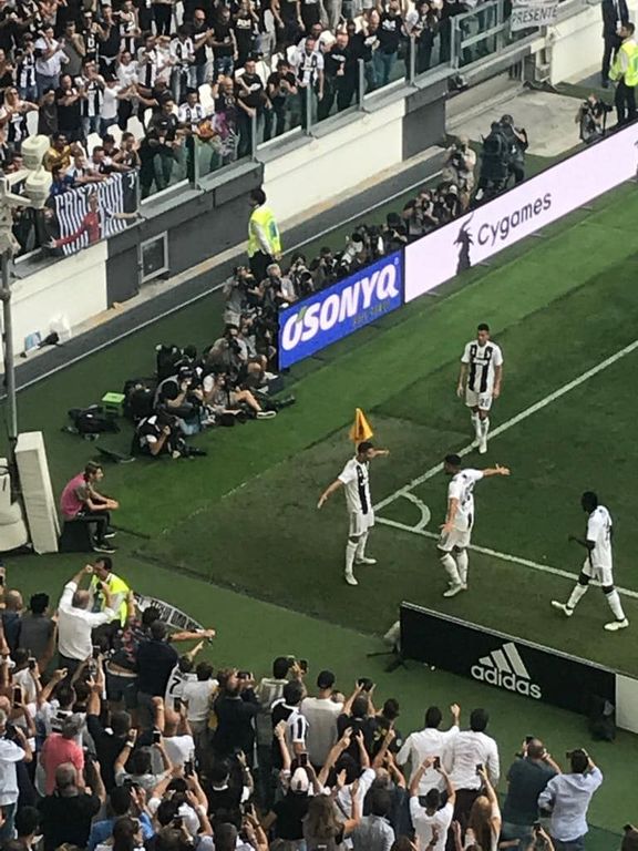 La ripresa si apre con la Vecchia Signora decisa a trovare il gol e dopo appena un minuto Ronaldo (su cross di Cancelo) non riesce ad indirizzare verso la porta. Il piglio del team di Allegri e soprattutto del suo numero 7 è però quello giusto e al 50' ecco che il momento più atteso dagli juventini, ma non solo, si concretizza: angolo battuto da Dybala sul secondo palo, Ferrari pasticcia di testa nel tentativo di allontanare e manda il pallone sul palo. La sfera carambola sui piedi di Ronaldo che a porta sguarnita segna il suo primo gol italiano. Juve in vantaggio!