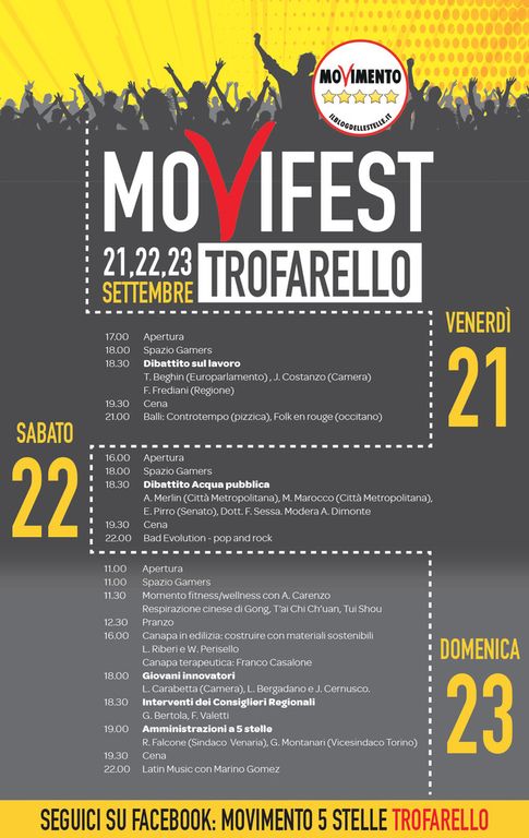 Un evento tradizionale per gli attivisti a 5 stelle del torinese, appuntamento fisso per ripartire, confrontarsi e ritrovarsi dopo la pausa estiva. Saranno tre giorni di dibattiti, confronto, musica, giochi e buona tavola con gli attivisti ed i rappresentanti del Movimento 5 Stelle a tutti i livelli.