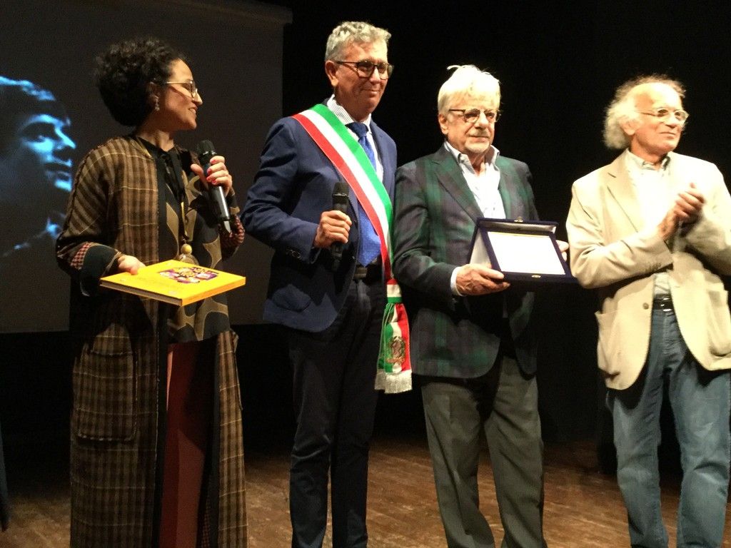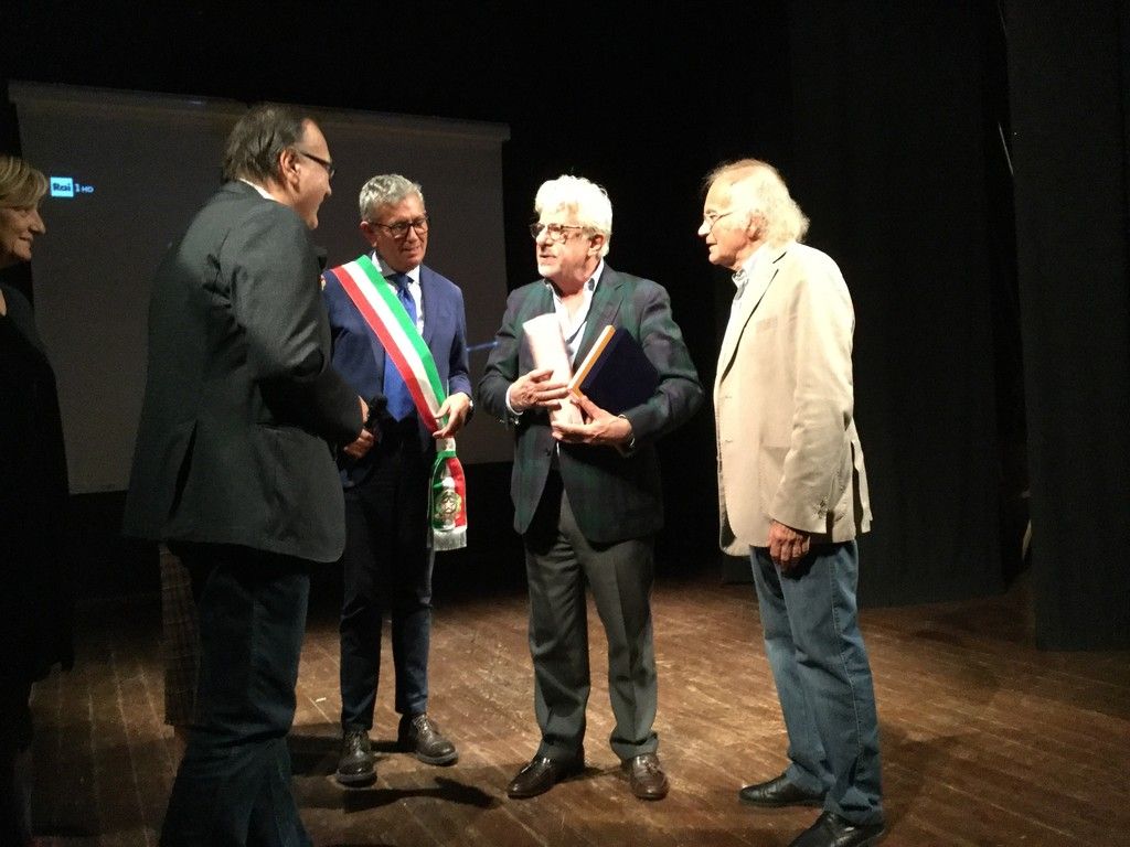 Giunto poco dopo le 18 al Teatrino Civico, Giancarlo Giannini ha ricevuto la targa con incisi questi versi dalle mani del sindaco Claudio Castello, che lo ha accolto insieme all'assessore regionale Gianna Pentenero e il direttore artistico della stagione “Chivasso in Scena”, Livio Viano. “Sono 25 anni che ricevo premi alla carriera – ha detto l'attore -: evidentemente portano bene, perché sono ancora qui a recitare”.