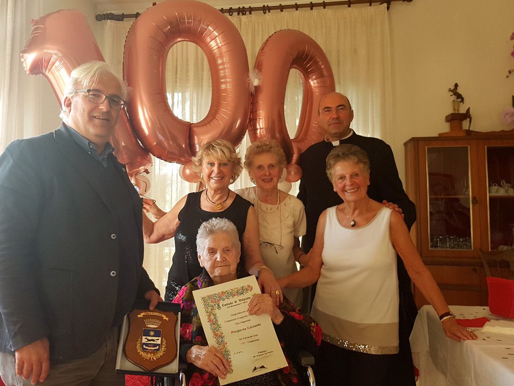 Margherita Raimondo, nata il 21 ottobre 1918, ha festeggiato oggi pomeriggio a Volpiano i suoi cento anni, insieme alle figlie Carla Bruna, Franca e Maria Cristina Cerutti, ai parenti e agli amici; erano presenti il sindaco Emanuele De Zuanne, che le ha consegnato la targa del Comune e una pergamena ricordo, il parroco don Claudio Bertero, e Marilena Milanesio, presidente del centro d'incontro «Alessandro Riboldi». Margherita Raimondo ha vissuto in Argentina dal 1948 al 1952, dove è nata la terza figlia, per poi ritornare in Italia con la famiglia.