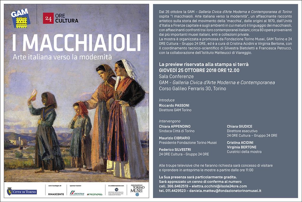 “I macchiaioli. Arte italiana verso la modernità”, organizzata e promossa da Fondazione Torino Musei, GAM Torino e 24 ORE Cultura – Gruppo 24 ORE, a cura di Cristina Acidini e Virginia Bertone, con il coordinamento tecnico-scientifico di Silvestra Bietoletti e Francesca Petrucci, vede la collaborazione dell’Istituto Matteucci di Viareggio e presenta circa 80 opere provenienti dai più importanti musei italiani, enti e collezioni private, in un ricco racconto artistico sulla storia del movimento, dalle origini al 1870, con affascinanti confronti con i loro contemporanei italiani.