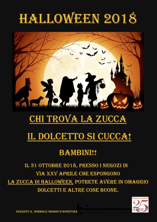 I negozi di via XXV Aprile che esporranno il volantino "La zucca di Halloween" nella giornata odierna omaggeranno i bimbi che vi entrano con dolcetti e altri doni. Anche l'associazione "Le Vetrine di via Torino" ha organizzato un'iniziativa dedicata ai piccoli. Basterà seguire i palloncini ed entrare nei negozi aderenti di via Torino e del centro per fare 'dolcetto o scherzetto'. Buon Halloween a tutti.