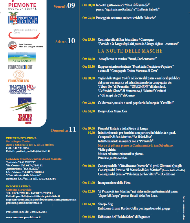 Saranno la trattoria Salvetti in piazza a Paroldo (0174/789131) e l’agriturismo Raflazz nell’omonima cascina (0174/789074) ad ospitare l’evento, come ormai da tradizione. Dopo la cena alle 23,00, accompagnati dal Presidente dell’Associazione “Masche di Paroldo” Romano SALVETTI, passeggiata notturna sui sentieri delle “masche”.