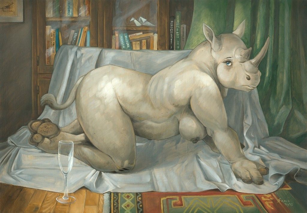 Il dipinto che ho esposto a Paratissima è un buon esempio della mia produzione attuale. Come faccio spesso sono partito da uno stereotipo culturale a tema animalesco – la leggenda urbana secondo cui gli elefanti avrebbero paura dei roditori – e ho immaginato una situazione vagamente umoristica che lo stravolgesse. Qui le roditrici diventano servitrici di un’elefantessa di alto rango, in una scena ispirata all’arte orientalista ma di cui ho volutamente offuscato la collocazione temporale inserendo alcuni dettagli chiaramente moderni.