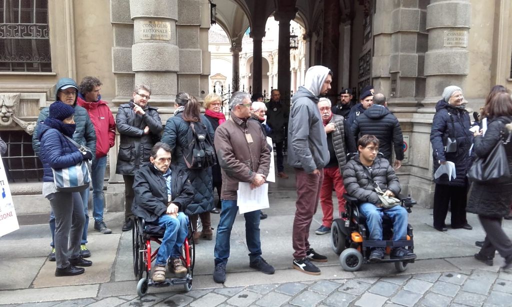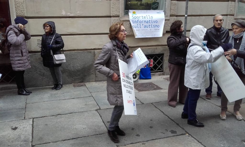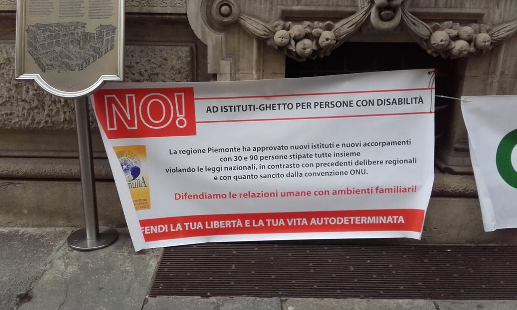 No alla creazione di nuovi istituti! Con questo, e molti altri slogan, circa un'ottantina di partecipanti si sono ritrovati, questa mattina, per protestare contro il parere favorevole della Regione Piemonte alla realizzazione di due strutture residenziali da 30 posti letto a Moncalieri e l'accorpamento di 90 persone con disabilità in un unico edificio a Pinerolo.