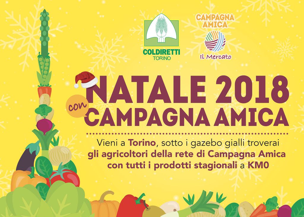 Fabrizio Galliati, presidente Coldiretti Torino, informa: «I coltivatori in vendita diretta portano in città le eccellenze del nostro territorio per i menù delle feste di fine 2018». Queste le date dei mercati di Campagna Amica a Torino: a novembre, domenica 25, in piazza Bodoni; domenica 2 dicembre, in piazza Palazzo di Città; sabato 8 dicembre, in piazza Palazzo di Città; domenica 9 dicembre, in piazza e giardini Cavour; domenica 16 dicembre, in piazza Vittorio Veneto; domenica 23 dicembre, in piazza Bodoni; domenica 6 gennaio 2019 in piazza Palazzo di Città.