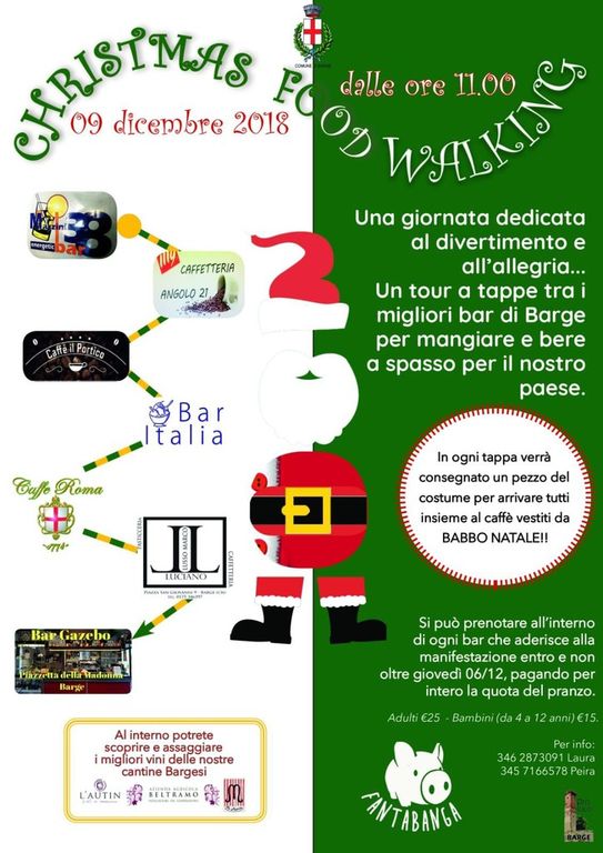 Domenica 9 dicembre dalle ore 11 si svolgerà a Barge la 1^ Edizione del Christmas Food Walking , una divertentissima e gustosa giornata dedicata a tutti gli aspiranti Babbo Natale. Sì, perché il tour a tappe tra i migliori bar di Barge dove si potrà mangiare e bere , comporterà anche il recuperare via via pezzi del costume di Babbo Natale fino al raggiungimento del totale travestimento e al dedicarsi tutti insieme un caffè insieme agli auguri di Buon Natale!