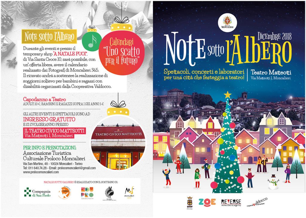 Lunedì 31 dicembre dalle ore 22 ProLoco Moncalieri e Reverse presentano L'apprendista stregone, uno spettacolo di magia per bambini e famiglie. A seguire brindisi di capodanno. Domenica 6 gennaio 2019 dalle ore 16.30 alle 19.30 Ballerina e la calza della befana: pomeriggio di festa con animazione e proiezione del cartone “Ballerina”. A cura di Casa Zoe e Pro Loco Moncalieri.