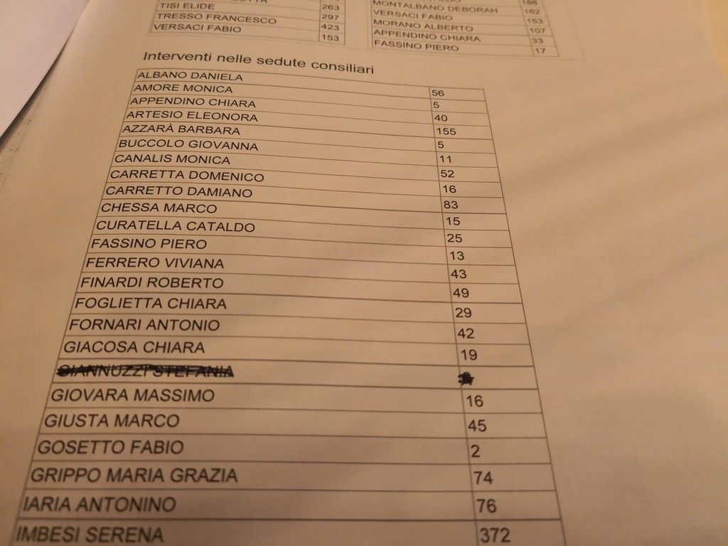 A pagina 8, nell'elenco in ordine alfabetico degli interventi nelle sedute consiliari, compare cancellato con un tratto di biro il nome dell'ex assessore Stefania Giannuzzi tra quello dei consiglieri del M5S Chiara Giacosa e Massimo Giovara.