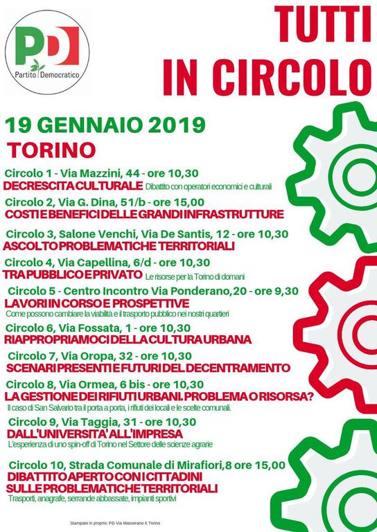 Settimana movimentata per i circoli torinesi. Oltre a essere impegnati nelle riunioni per il congresso nazionale, i dieci circoli della città hanno messo in campo un’iniziativa sul "futuro di Torino." L'appuntamento è fissato sabato 19 gennaio, a partire dalle 10.