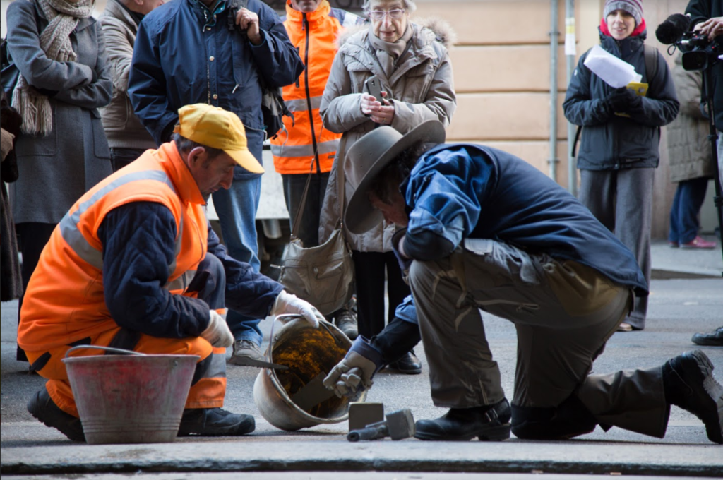 Ancora una volta, dunque, l’artista collocherà le piccole targhe di ottone incastonate su cubetti di cemento che sono poi incassati nel selciato di fronte all’ultima abitazione scelta liberamente dalla vittima. Ogni targa riporta la scritta “Qui abitava...”, il nome della vittima, data e luogo di nascita e di morte/scomparsa. In tutta Europa sono state posate più di sessantamila pietre.