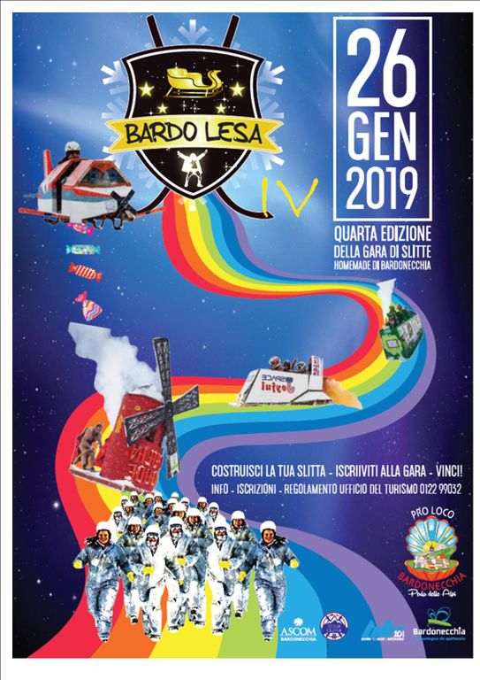 Tutto pronto per lo svolgimento della IV edizione della “BardoLesa”, gara con slitte (lese appunto), da neve progettate e costruite dai partecipanti, organizzata dalla Proloco, in collaborazione con il Comune di Bardonecchia e la Colomion Spa, allo scopo di stimolare la creatività delle persone volta al divertimento, all’aggregazione e alla valorizzazione del territorio.
