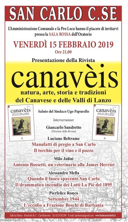 Da anni la rivista semestrale “Canaveis” racconta la storia, descrive l’arte e la natura, divulga la cultura del Canavese e delle Valli di Lanzo attraverso le sue pagine ricche di notizie e curiosità. Il 15 febbraio, alle ore 21, il periodico sarà presentato a San Carlo Canavese presso la Sala Rossa dell’Oratorio. L’evento è stato organizzato grazie alla disponibilità della Pro Loco e dell’Amministrazione Comunale. Il sindaco Ugo Papurello porterà il suo saluto e modererà la serata il direttore Giancarlo Sandretto. Interverranno i collaboratori della rivista Milo Julini che parlerà d’un veterinario canavesano dell’ottocento, Pierfelice Ronco che racconterà le vicende legate alla frazione Boschi di Barbania, Luciano Beltrame che illustrerà il celeberrimo torchio settecentesco sancarlese ed Alessandro Mella che parlerà di un evento accaduto proprio a San Carlo in epoca umbertina. Un serata molto particolare per appassionati, curiosi e per tutta la popolazione invitata, naturalmente, a partecipare numerosa.
