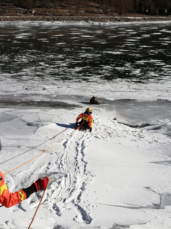 Il personale Saf, con mute stagne e tramite manovre speleo alpine fluviali, ha provveduto a recuperare l'animale e a portarlo in zona sicura