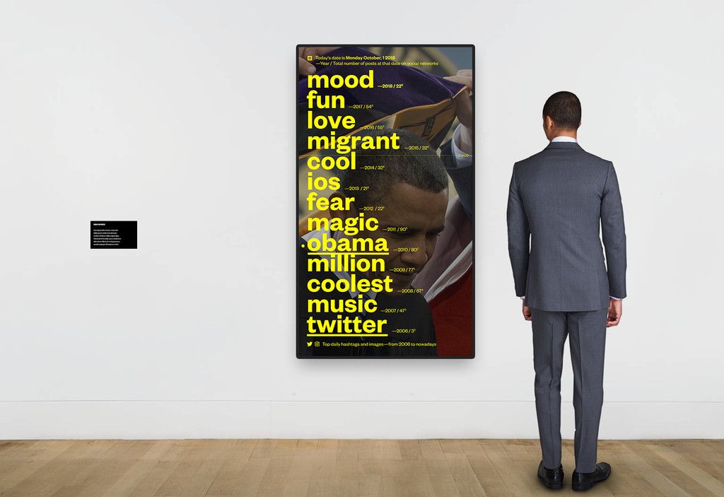 Come un calendario perpetuo, #HashedTime permette di stabilire collegamenti tra parole e immagini nel tempo, a partire dalla data corrente. Grazie a questa lettura verticale, diventa possibile rintracciare i temi e gli argomenti principali del dibattito pubblico o seguire le passioni degli utenti.