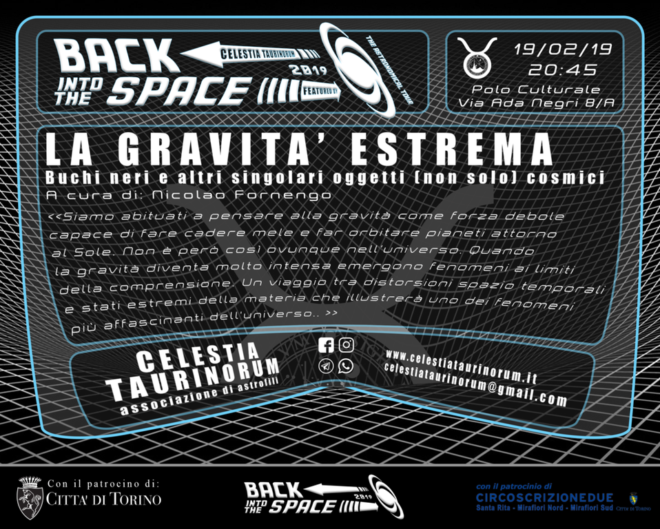 Il primo talk ha per titolo “La Gravità Estrema” e sarà a cura del Professor Fornengo dell’Università di Torino. I cinque appuntamenti avranno cadenza mensile, estendendosi fino a giugno 2019.