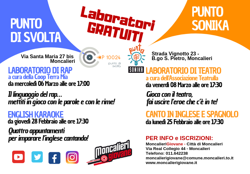 I laboratori sono gratuiti. Per informazioni e iscrizioni rivolgersi a MoncalieriGiovane - Ufficio Giovani Città di Moncalieri in Via Real Collegio 44 oppure telefonare al numero 011.6401460/447 o mandare una email all’indirizzo moncalierigiovane@comune.moncalieri.to.it