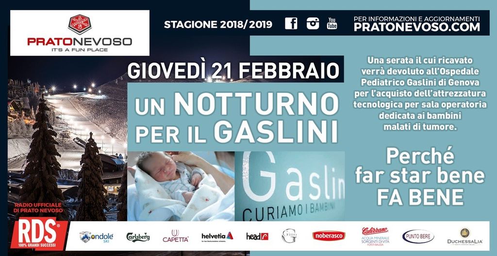 Una serata di sci sulle nevi di Prato Nevoso per raccogliere a favore dei bimbi del Gaslini. Giovedì 21 febbraio si svolgerà “Un notturno per il Gaslini”: la stazione sciistica di Prato ha scelto di devolvere l’intero incasso della serata e dello sci notturno alla campagna pro Gaslini. Le piste saranno aperte dalle 20 alle 23 al costo dello skipass di 14 euro. Con il ricavato di questa iniziativa grazie a Prato Nevoso, il Gaslini attrezzerà un ambulatorio per i piccoli pazienti che hanno terminato le cure oncologiche.