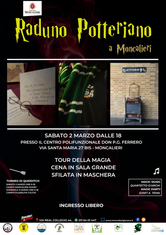 Dalle ore 18 al Centro Polifunzionale Don PG Ferrero in Via Santa Maria 27 bis (ingresso angolo via Don Fornelli): Tour della magia con creature magiche, pozioni, quadri viventi e lezioni di erbologia e la colonna sonora di un magico quartetto di archi che ci allieterà fino alla Cena in sala grande. Alle ore 21 spettacolo di magia con Torino Magic Academy e a seguire, la sfilata di tutti i partecipanti in costume con premiazione finale del personaggio più riuscito: troveremo l’Harry Potter moncalierese? O sarà Ermione ad affascinare la platea? Qualcuno avrà il coraggio di vestirsi da ricordella? A concludere la serata il DJ Set di Jaku Feliz Reyes.