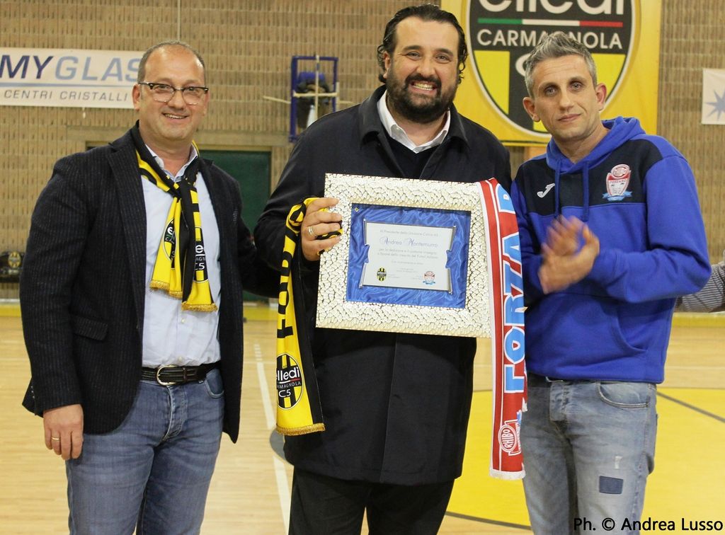 Nell'intervallo, saluti ufficiali del presidente Andrea Montemurro, con i presidenti Dario Lamberti (Carmagnola) e Fabrizio Rocca (Fossano) che hanno omaggiato il numero uno del calcio a 5 italiano, con targa e sciarpe.
