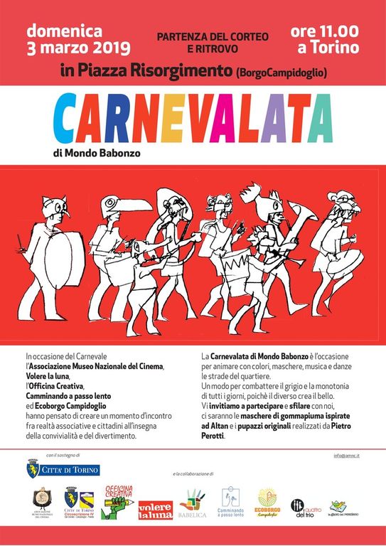 L'ultima domenica di Carnevale l’Officina Creativa e l’Associazione Museo Nazionale del Cinema (AMNC) organizzano un momento d’incontro fra realtà socio-culturali attive sul territorio e cittadini all’insegna della convivialità e del divertimento: la Carnevalata di Mondo Babonzo è l’occasione per animare con colori, musica e danze le strade del quartiere Borgo Campidoglio, contesto unico nella città, vero e proprio laboratorio di comunità che offre continuamente esempi innovativi di partecipazione dal basso.