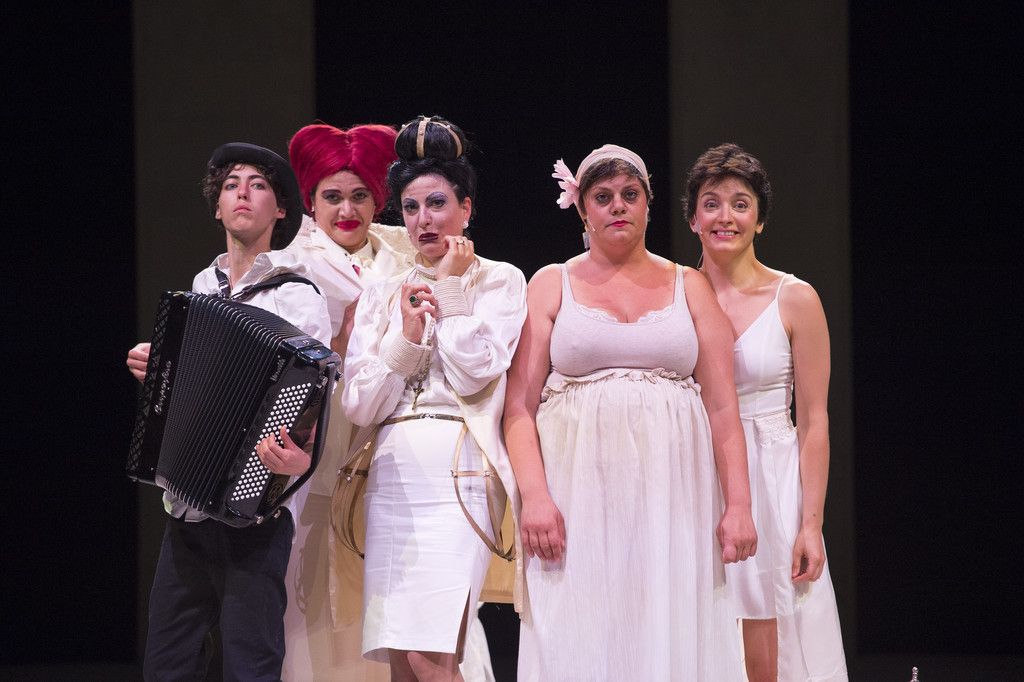 La scrittura di Edoardo Erba e la regia di Serena Sinigaglia riadattano, tagliano e montano con ironia Le allegre comari di Windsor, innestando brani, suonati e cantati dal vivo dal Falstaff di Verdi. In scena solo la signora Page, la signora Ford, la giovane Anne Page e la serva Quickly, che danno parola anche ai personaggi maschili, assenti ma molto presenti: mariti, amanti, e, soprattutto, il più grande, non solo per stazza, Falstaff. Da lui tutto comincia e con lui tutto finisce. Le lettere d’amore che il Cavaliere invia identiche alle signore Page e Ford sono lo stimolo per trasformare il solito barboso e very british pomeriggio di tè in uno scatenato gioco dell’immaginazione, del desiderio, del divertimento. “Punire” quel porco di Falstaff, che osa far loro esplicite richieste d’amore, diventa il grimaldello per sentirsi ancora vive. Senza Falstaff, non ci sarebbe divertimento o sfogo per le signore Page e Ford, che, come le Desperate Housewives, sono donne di mezza età, borghesi, annoiate e un pizzico bigotte, con routine consolidate, mariti assenti e desideri sopiti. «Per la sua ostentata dissolutezza in Falstaff si possono scorgere dei tratti di Don Giovanni e respirare aria buona di libertà; nella sua evidente “decadenza” si rispecchia quanto di più umano e disarmato si possa concepire», ci racconta la Sinigaglia, che ha voluto in scena anche una fisarmonicista che, oltre a suonare dal vivo le note di Verdi, interpreta Fenton, il grande amore di Anne, «un ruolo “en travesti” – prosegue – come vuole la tradizione shakespeariana (ma al contrario!)».