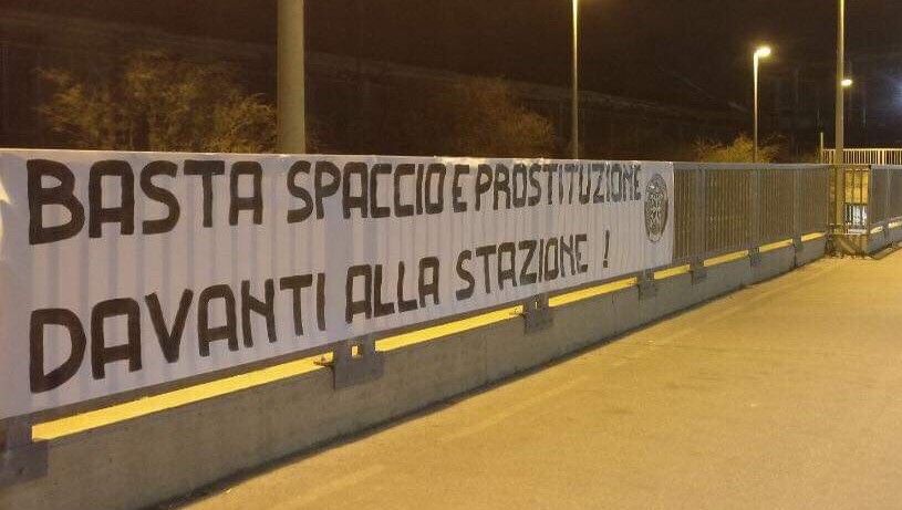 "Basta spaccio e prostituzione davanti alla stazione": questo il testo dello striscione affisso dai militanti di CasaPound nei pressi della stazione Fossata.