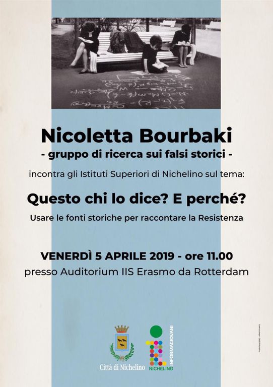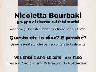 Come usare le fonti storiche per non farsi ingannare, soprattutto dai fake che girano nella rete? Se ne parlerà in un incontro degli Istituti Superiori di #Nichelino col collettivo "Nicoletta Bourbaki" (con il patrocinio della Città di Nichelino), in programma domani, venerdì 5 aprile, alle ore 11 presso l'auditorium dell'IIS Erasmo da Rotterdam di via XXV Aprile 139.