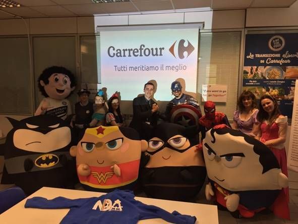 Carrefour Italia, da sempre attento alle tematiche di responsabilità sociale verso le comunità in cui è presente con i propri punti vendita, ha organizzato sabato 13 aprile una speciale donazione destinata all’Associazione Nazionale Italiana dell'Amicizia N.I.D.A. ONLUS, la quale potrà utilizzare le mascotte dei noti supereroi dei fumetti durante le visite ai bimbi ricoverati presso gli ospedali della città di Torino.